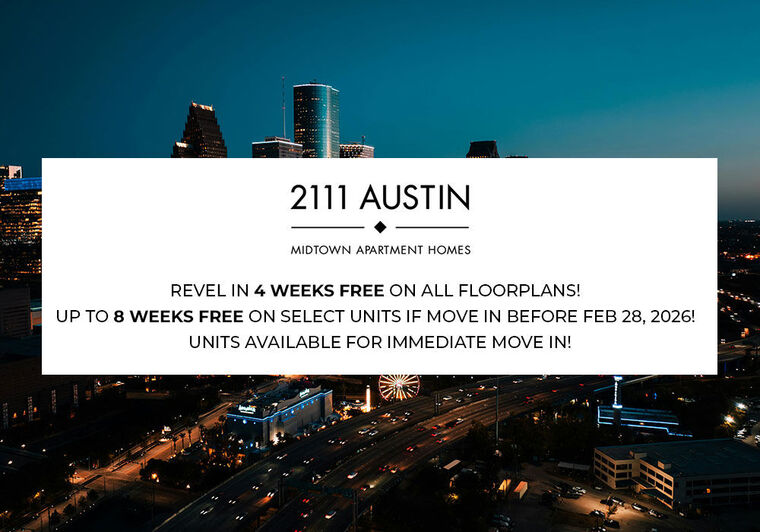 Located in Midtown (one block from Downtown), 2111 Austin offers urban living at its finest. From 2111 Austin you can walk or bicycle to restaurants and entertainment in both Midtown and Downtown. With the bike lane and a bike station at your front door, you can walk/bike to Metro Rail Redline and Northline, Midtown Park, Discovery Green and Park and Root Square. Mere minutes from Bagby/Gray restaurants and bars and all that Midtown and Downtown Houston has to offer.